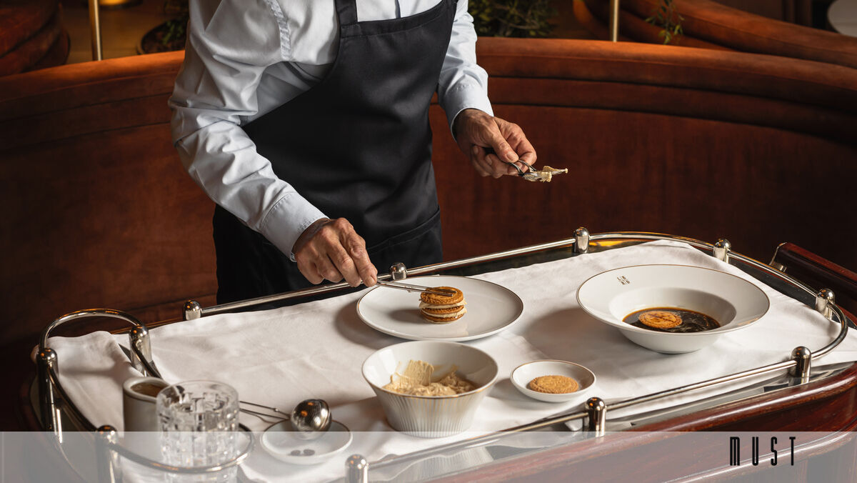 Esses rituais permanecem com igual protagonismo. O bife continua a ser misturado na sala e ajustado ao gosto de cada cliente, e os crepes flambeados no momento com uma destreza própria de um malabarista. Este tipo de serviço, quase desaparecido, volta agora a ganhar popularidade — mesmo que sob nomes mais “modernos”, como showcooking — mas aqui nunca deixou de existir. O próprio bolo de bolacha foi pensado para ser montado à frente do cliente.