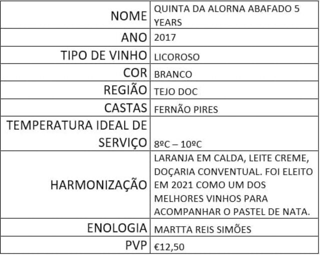 Os responsáveis da casa no Tejo explicam que este vinho licoroso é feito exclusivamente com Fernão Pires, "uma das castas mais nobres e plenamente adaptada ao terroir da Quinta da Alorna". Os responsáveis não conseguem precisar como e quando surgiu a produção deste vinho, mas garantem que lhes permite mostrar a versatilidade desta casta. O nome diz respeito ao processo de abafar o vinho nesta região, seguido do estágio de cinco anos que o caracteriza. Relativamente à vinificação, a Alorna refere que o mosto clarificado, após ligeira fermentação, é "abafado" com aguardente vínica, impedindo que continue a fermentar, ficando com uma quantidade de açúcar residual elevada. O licoroso é caracterizado por apresentar uma textura suave, equilibrando frescura e doçura. Após o estágio em barricas de carvalho antigas, permanece em cuba inox até ao engarrafamento.
