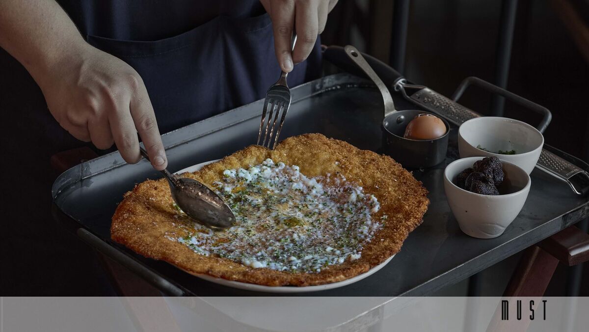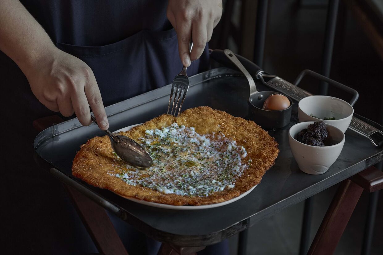 Ainda assim, há coisas que nunca mudam, especialmente a tarte de queijo Fismuler, feita com três tipos de queijo (fumado, fresco e azul) e, acima de tudo, o famosíssimo escalope San Román, com ovo e lascas de trufa. É um escalope com 40 cm de comprimento, enorme, pensado para partilhar — como a maioria dos pratos — e finalizado à mesa, em frente ao cliente. É sempre cortado com uma colher.